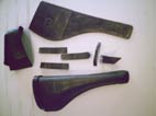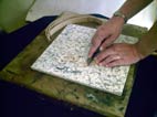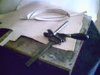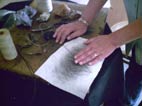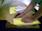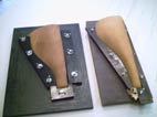 Das Leder, das in die richtige Form gebracht werden muss, wird in Wasser gelegt. Danach wird es in eine Holzform gelegt und an den Enden mit Klammern auf einem dicken Holzbrett befestigt. Zwei Tage später kann es zum exakten Schneiden herausgenommen werden.