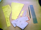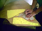 Für jedes Teil eines Holsters ist eine Schablone aus Pappe notwendig. Dieses wichtige Werkzeug ist später verantwortlich für dir korrekte Abmessung, Lederfestigkeit und Anzahl der Stiche. Die Schablone wird auf das ausgesuchte Stück Leder gelegt und ausgeschnitten. Spezielle scharfe Messer sind notwendig.