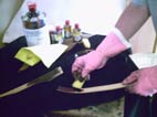Das beste Färbeergebnis wird mit Lederbeize erzielt. Wir mischen es von hell nach dunkel (Erfahrung!). Es ist notwendig die Farbprobe vorher an Reststücken zu machen. Das Leder muss völlig trocken sein, um die Farbe beurteilen zu können.